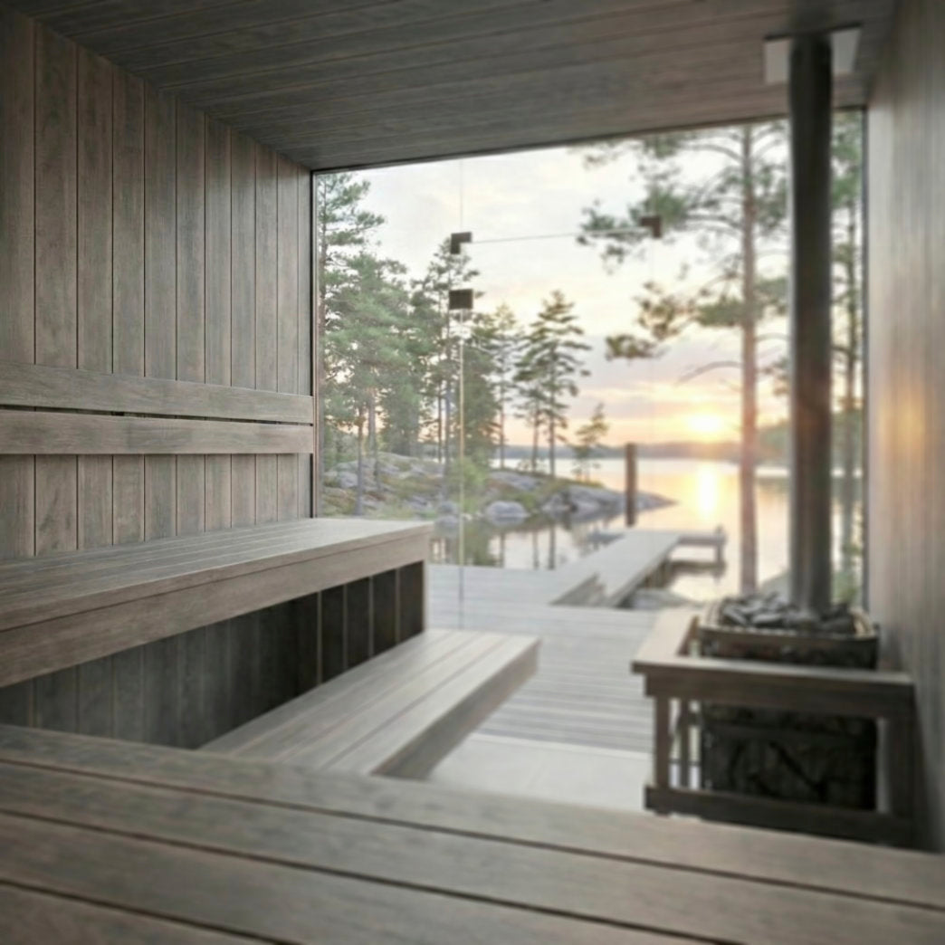 KUULAS-saunapaneelin tunnistettava ilme syntyy paneelin kuultavista sävyistä, jotka jättävät puun rauhallisen syykuvion näkyviin kuin usva takaansa hiljalleen hahmottuvan maiseman. Paneelin valmis sileä pinta yhdistettynä kapeaan avosaumaan on sekä tyylikäs että kaunis.